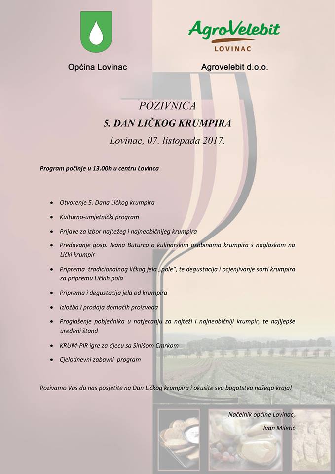Pozivamo Vas da nas i ove godine posjetite na petom po redu Danu Ličkog krumpira koji će se održati u centru Lovinca s početkom u 13.00h. Dan Ličkog krumpira održava se u suradnji općine Lovinac i poduzeća Agrovelebit d.o.o.. Ove godine za posjetitelje ličke delicije pripremaju učenici srednje strukovne škole Gospić, očekuje nas kulturno-umjetnički program, brojni izlagači domaćih proizvoda i mnogo zabave za djecu i odrasle. Ove godine održavaju se i Krum-PIR igre sa Sinišom Cmrkom.