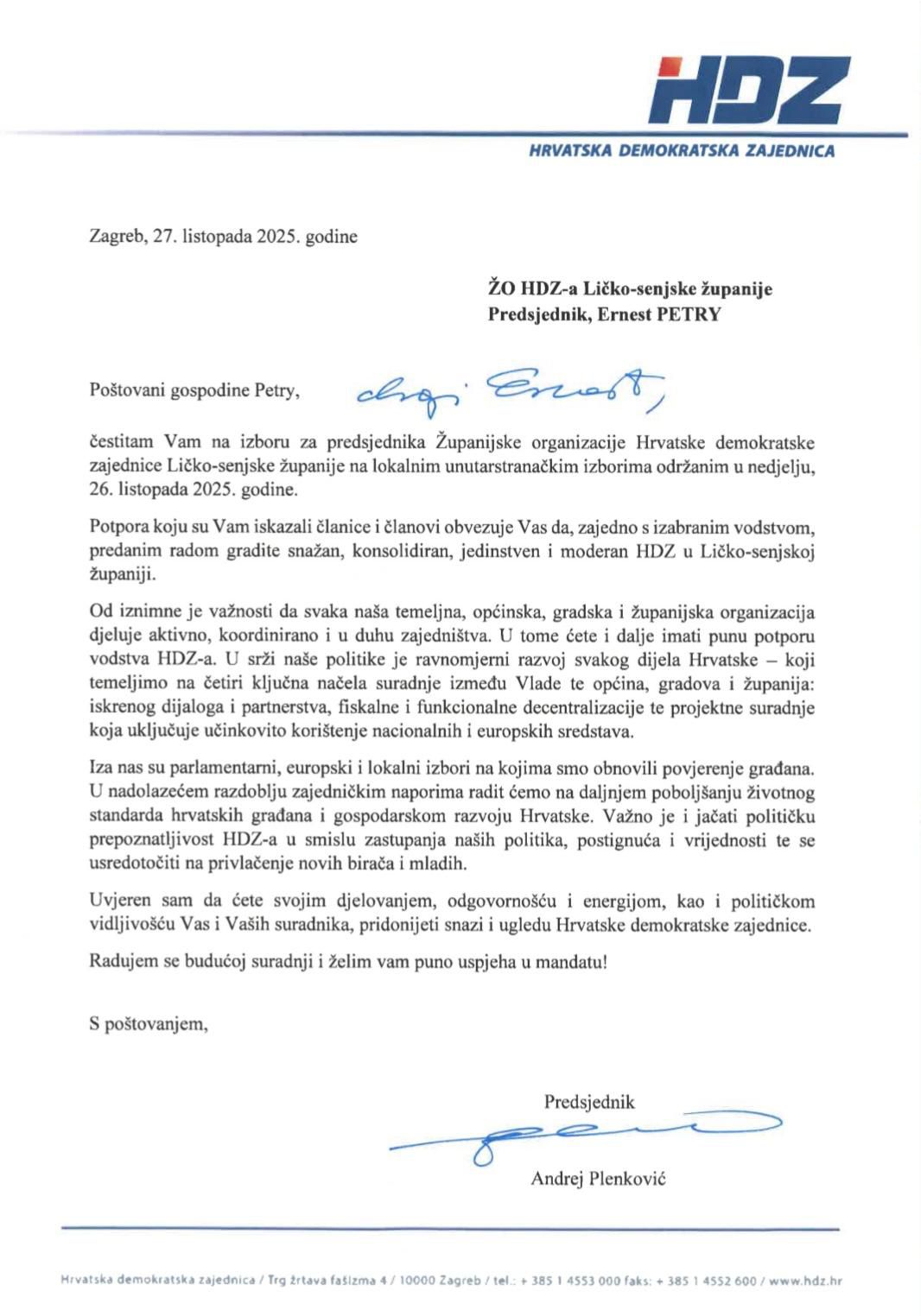 Predsjednik Hrvatske demokratske zajednice Andrej Plenković uputio je čestitku Ernestu Petryju povodom njegovog ponovnog izbora za predsjednika Županijske organizacije HDZ-a Ličko-senjske županije, koji je izabran na unutarstranačkim izborima održanim 26. listopada 2025. godine.