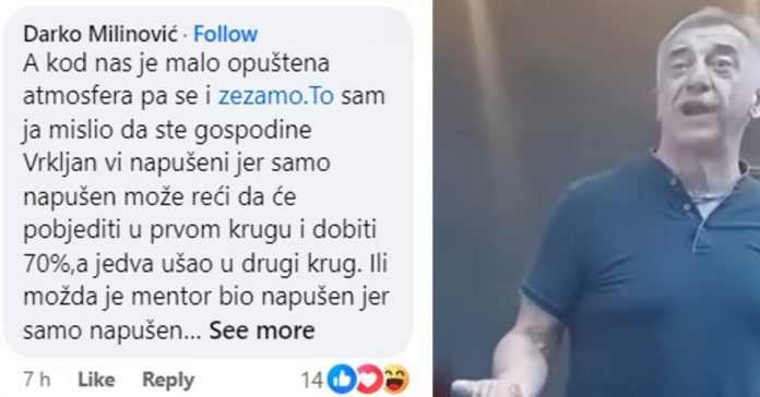 – A kod nas je malo opuštena atmosfera pa se i zezamo.To sam ja mislio da ste gospodine Vrkljan vi napušeni jer samo napušen može reći da će pobijediti u prvom krugu i dobiti 70%, a jedva ušao u drugi krug. Ili možda je mentor bio napušen jer samo napušeni hvataju za vrat ako netko ‘krivo pleše‘ pa ga izbaci iz utrke za gradonačelnika. Josoooo najbolje jezičić za zube kao u dosadašnjem djelu kampanje jer može biti neugodno, napisao je Milinović.