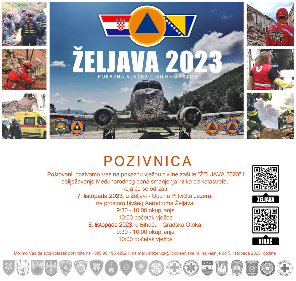 U suradnji sa Unsko-sanskim kantonom održat će se zajednička vježba civilne zaštite pod nazivom “Željava 2023.g.” i obilježavanje Međunarodnog dana smanjenja rizika od katastrofa, stoga Vam u privitku dostavljamo pozivnicu za predmetnu pokaznu dvodnevnu vježbu koja će se provesti na području Općine Plitvička jezera, Ličko Petrovo Selo– područje bivšeg aerodroma Željava 07. listopada 2023. s početkom u 10 sati i 08. listopada 2023. na području grada Bihaća- Gradska Otoka, BIH, s početkom u 10 sati.
