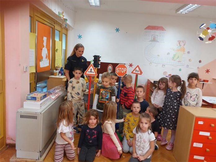 Policijska službenica je djeci uručila set prometnih znakova i didaktičke igre o prometu kako bi kroz redovitu igru od najranije dobi stekli znanja i vještine za sigurno sudjelovanje u prometu, a pokloni su nabavljeni sredstvima dobivenim iz „Nacionalnog plana sigurnosti cestovnog prometa 2021. – 2030. godine“.