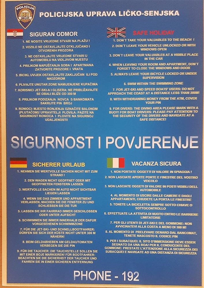 - na samozaštitno ponašanje – da zatvaraju vrata i prozore kada napuštaju apartmane ili sobe u kojima borave, da ne nose na plažu veće količine novca ili vrijednije predmete, te da novac mijenjaju u bankama, mjenjačnicama ili drugim ovlaštenim mjestima,