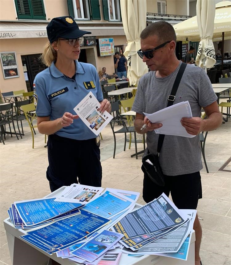 U sklopu projekta međunarodne policijske suradnje „Sigurna turistička destinacija“ policijska službenica za prevenciju Policijske uprave ličko – senjske i kontakt policajac Policijske postaje Novalja jučer su na Trgu bazilike u Novalji sa slovenskim i talijanskim policijskim službenicima koji borave na području Policijske uprave ličko-senjske preventivno djelovali