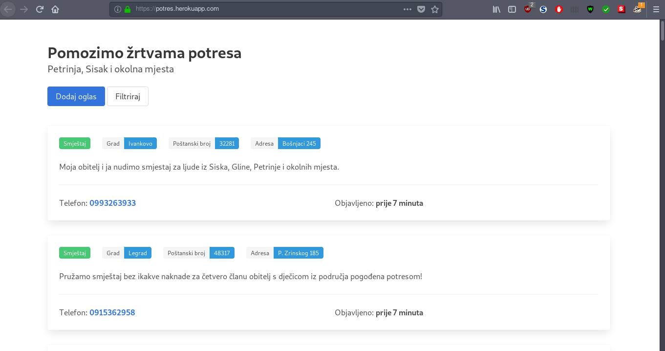 -lista svih koji su ponudili pomoć i smještaj, te onih koji traže pomoć i smještaj koristite se mapom s podacima sa strane za napraviti pregled uvida u situaciju i afektiranih područja.