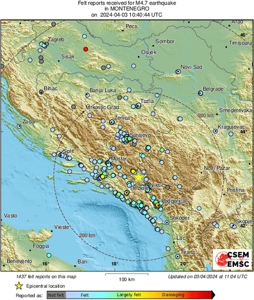 Prema podacima EMSC-a, potres se osjetio i na jugu Hrvatske, a preliminarna magnituda iznosi 4,7 Richtera.