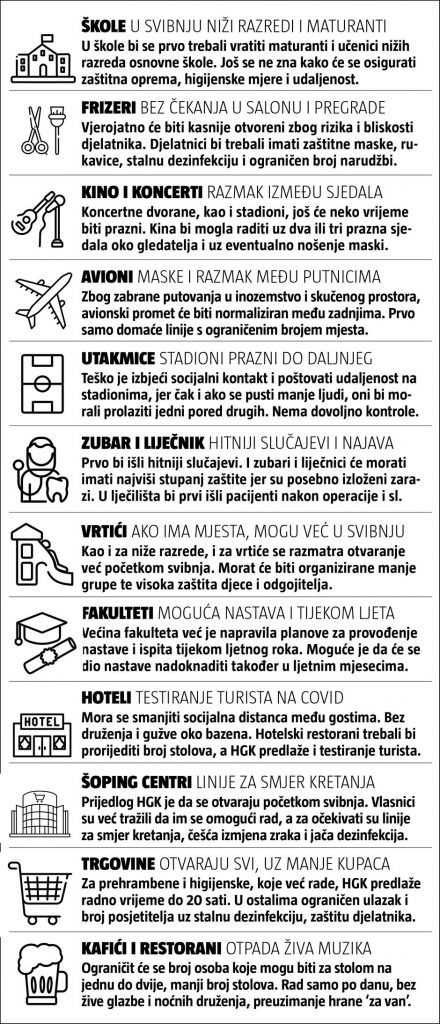 Time odgovara i zahtjevu Hrvatske gospodarske komore koja je Vladi poslala zahtjeve da se otvore obrti, trgovine namještajem, automobila, a zatim i trgovački centri, da se vrati javni prijevoz, produlji radno vrijeme za trgovine koje sad rade. Tu su i prijedlozima zaštitnih mjera koje bi to trebale pratiti.