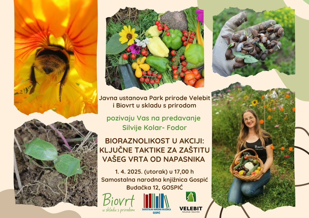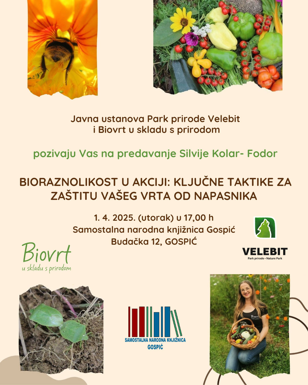 Javna ustanova Park prirode Velebit i Udruga Biovrt u skladu s prirodom pozivaju Vas na predavanje koje će se održati 1. travnja 2025. godine u Samostalnoj narodnoj knjižnici Gospić, s početkom u 17:00 sati.