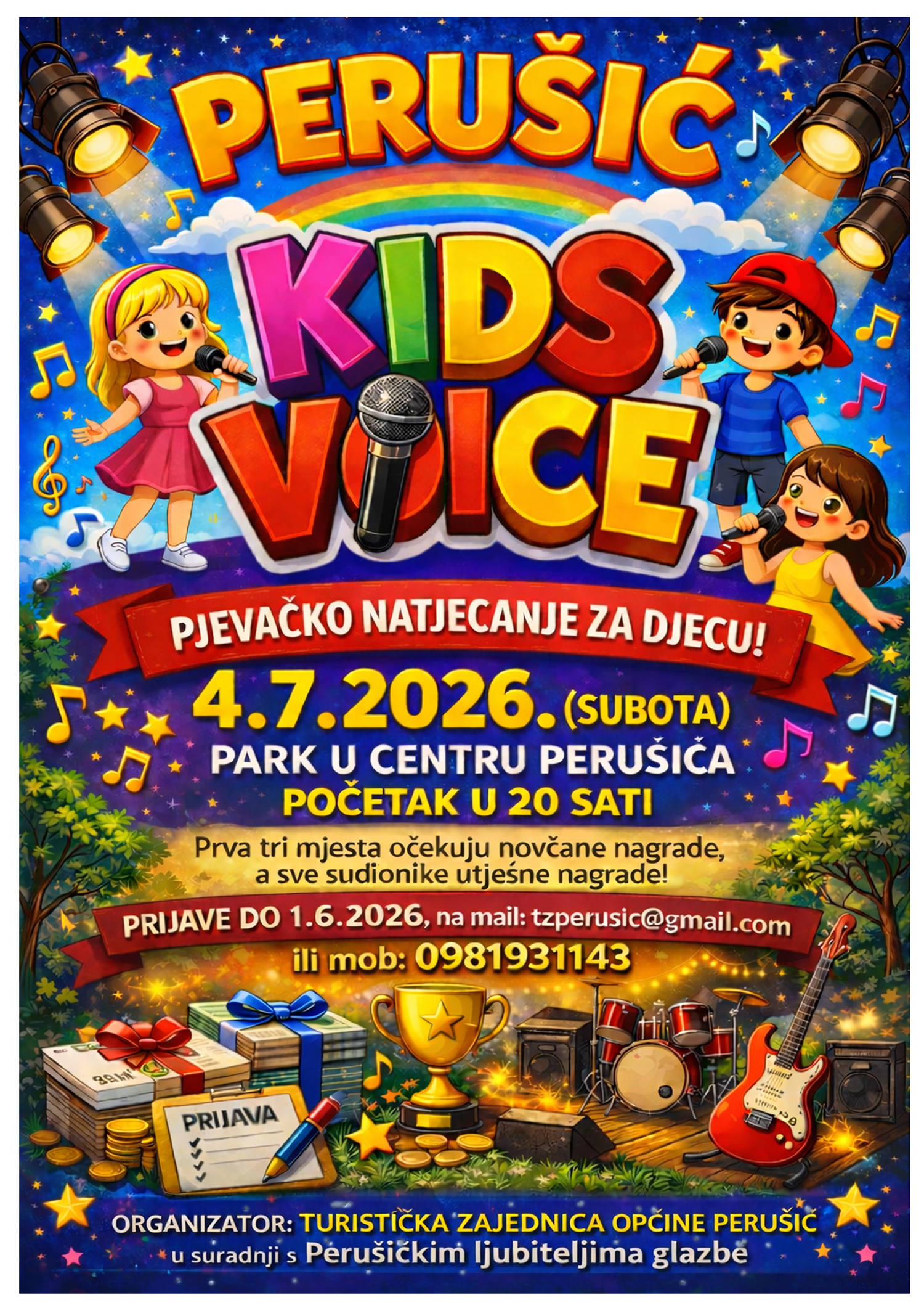 Za prijavu je potrebno poslati osnovne podatke o kandidatu, uključujući ime i prezime, dob, kontakt roditelja ili skrbnika te adresu kandidata. Uz prijavu potrebno je navesti i pjesmu s kojom će se kandidat predstaviti na Perušić Kids Voiceu. Prijave se zaprimaju putem e-maila: tzperusic@gmail.com ili pozivom na broj: +385 981931143, a traju zaključno do 1. lipnja 2026. godine.