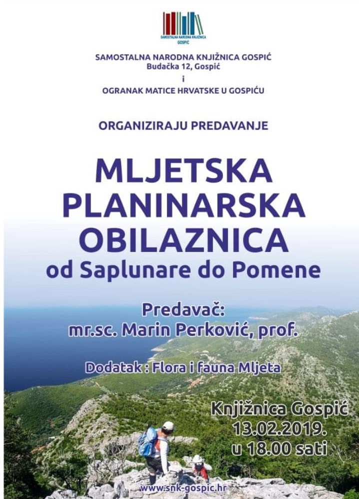 Samostalna narodna knjižnica Gospić i Matica hrvatska, ogranak Gospić za srijedu, 13. veljače najavljuju zanimljivo predavanje. Na temu „Mljetska planinarska obilaznica od Saplunare do Pomene“ govorit će mr. sc. Marin Perković. Pripovijest o ovoj temi bit će dodatno osvježena podacima o flori i fauni Mljeta. Predavanje će se održati u prostorijama Samostalne narodne knjižnice Gospić s početkom od 18 sati.