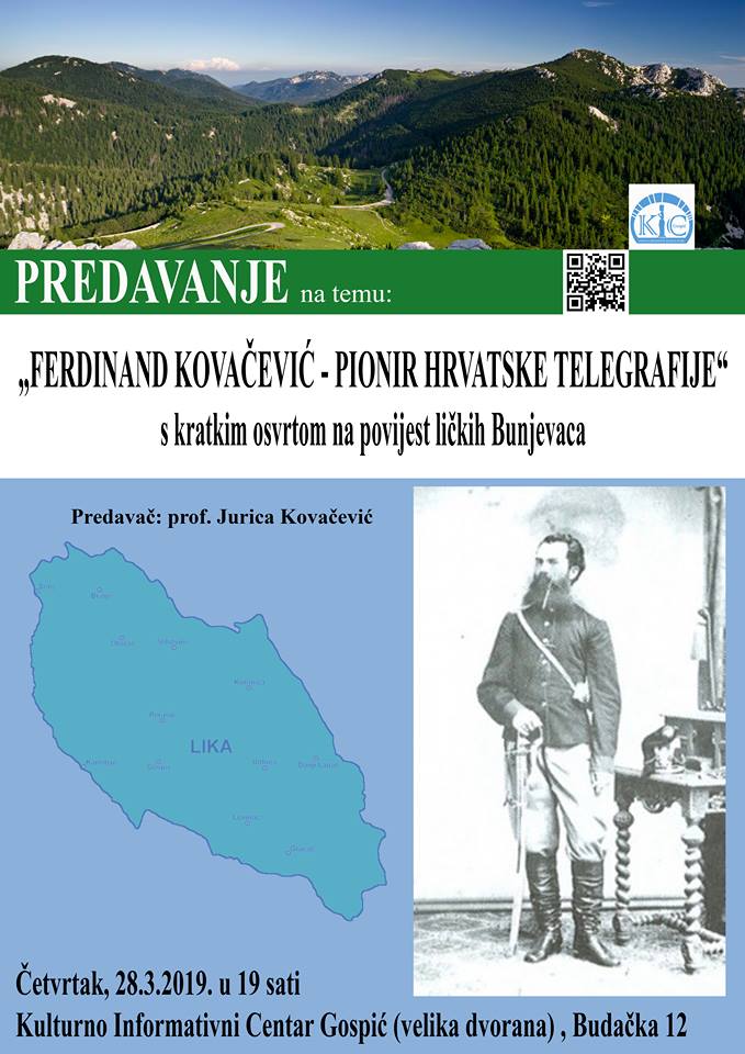 Ferdinand Kovačević rođen je u Gospiću 1838. godine, a rodom je iz Smiljana. Na polju znanosti dao je veliki doprinos  razvoju telegrafije i elektrotehnike u Hrvatskoj koja je u to vrijeme bila dio Austro – Ugarske Monarhije, a Lika dio austrijske Vojne krajine. Predavač Jurica Kovačević opisat će njegov životni put od rođenja do smrti. Osvrnut će se i na povijest ličkih Bunjevaca od kojih je potekao i sam Ferdinand Kovačević. Bunjevci su jedna velika skupina hrvatskog naroda koja je stigla u Liku još u 17. stoljeću, a iz te skupine potekli su mnogi značajni ljudi iz našeg kraja.