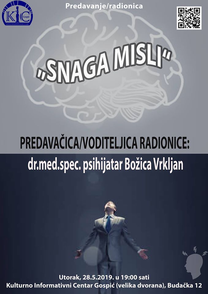 „Dođite 28. svibnja u 19 sati u KIC Gospić, zajedno ćemo pronaći načine kako da generator naših misli, naš veličanstveni mozak nadmudrimo da svojom tajanstvenom sivom materijom što više radi u našem interesu, te da iskoristimo neograničeni kreativni potencijal naših misli pretvarajući destruktivne misaone obrasce u konstruktivne.“ – poruka je dr. Božice Vrkljan.