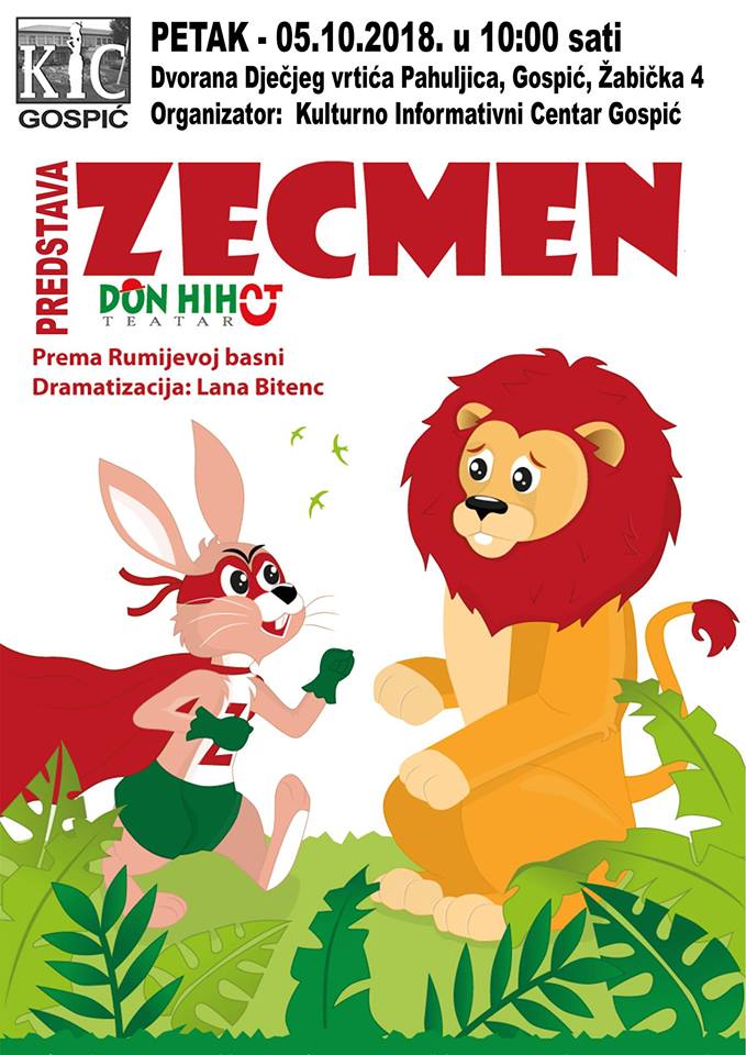 Povodom obilježavanja Dječjeg tjedna 2018., KIC Gospić mališanima Dječjeg vrtića Pahuljica, Gospić poklanja predstavu „Zecmen“ u izvedbi Teatra Don Hihot. Predstava će se održati u prostorijama Dječjeg vrtića Pahuljica, Gospić u petak, 5. listopada 2018. s početkom u 10 sati, a pozivaju se i roditelji mališana koji ne pohađaju vrtić da dovedu svoju dječicu kako bi se zabavili uz Zecmena! Zecmen je glumačko-lutkarska te edukativno-ekološka predstava za djecu s mnoštvo vedre glazbe. To je poučna priča o zečiću koji je svojom lukavošću, iako malen, uspio nadmudriti velikog lava i tako pomoći svojim prijateljima da imaju miran život u svojoj šumi. Na kraju predstave slijedi razgovor i druženje s lutkama!