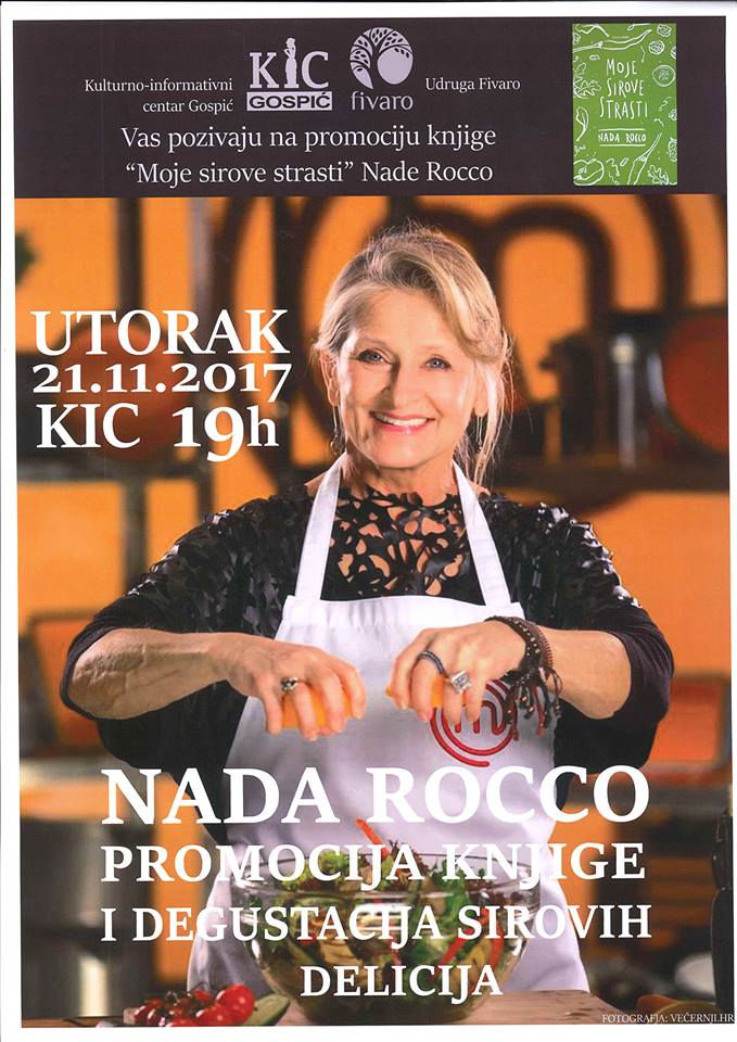 Klub „Utorkom o zdravlju“ i Kulturno Informativni Centar Gospić pozivaju Vas na predstavljanje knjige – priručnika za sirovojedstvo Nade Rocco pod nazivom „Moje sirove strasti“. Knjigu će predstaviti autorica Nada Rocco.