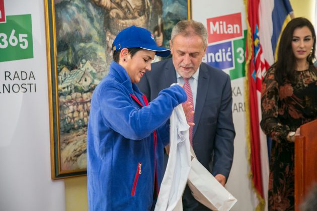 Nakon predstavljanja stranke Milan Bandić u društvu predsjednice gospićkog ogranka Danijele Bogić predsjednici DND Grada Gospića Sanji Puškarić uručio je prigodni poklon.