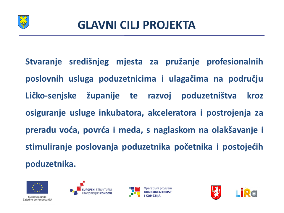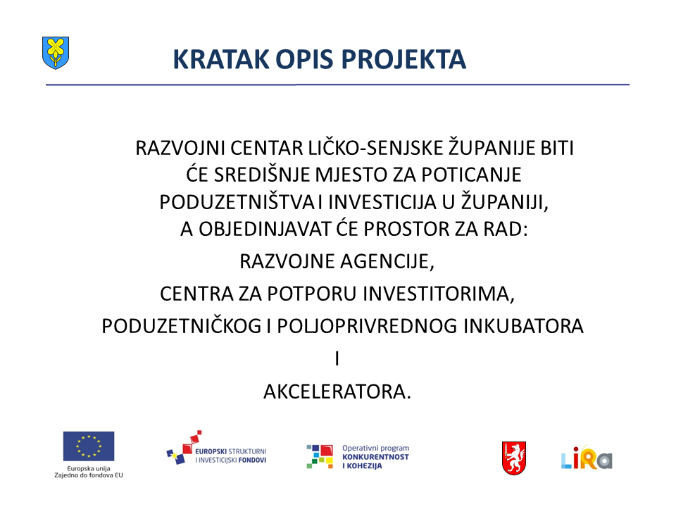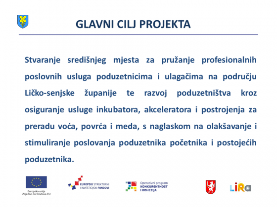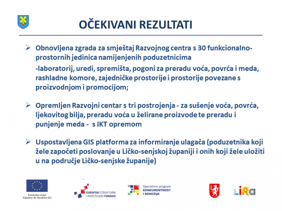 -Pozdravljam predstavnike partnera, Grada Gospića i LIRA-e. S nama je i pročelnica Ana Rukavina Stilinović zadužena  za operativno vođenje projekta. Cilj ovoga projekat usmjeren je na stvaranje središnjeg mjesta za pružanje profesionalnih usluga poduzetnicima i budućim ulagačima na području naše županije, kao i razvoj poduzetništva kroz usluge inkubatora, akceleratora i postrojenja za preradu voća i meda. Posebno je važno istaknuti kako će Razvojni centar olakšati i stimulirati rad poduzetnika početnika i sadašnjih poduzetnika. Ukupna je vrijednost projekta je 18.998.571 kuna, od čega će ga sa 18.608.890 kuna financirati EU.  rekao je župan dr. Milinović.