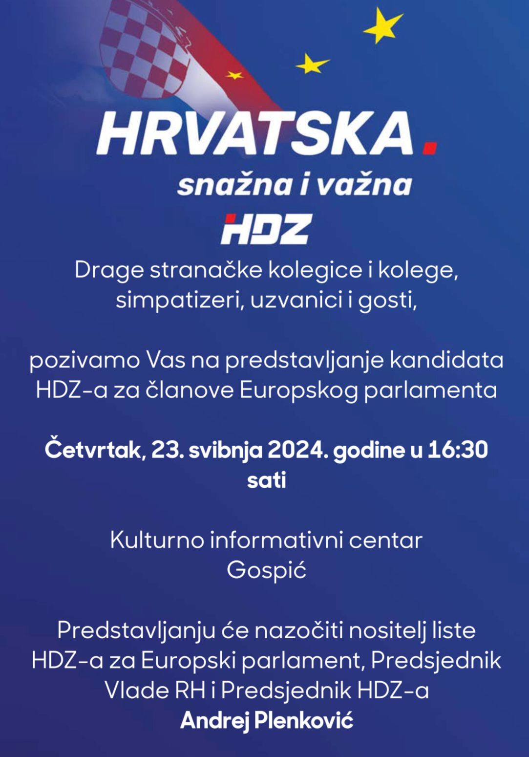 U četvrtak, 23. svibnja 2024. godine, u Kulturno informativnom centru Gospić, održat će se predstavljanje kandidata Hrvatske demokratske zajednice (HDZ) za članove Europskog parlamenta. Događaj počinje u 16:30 sati.