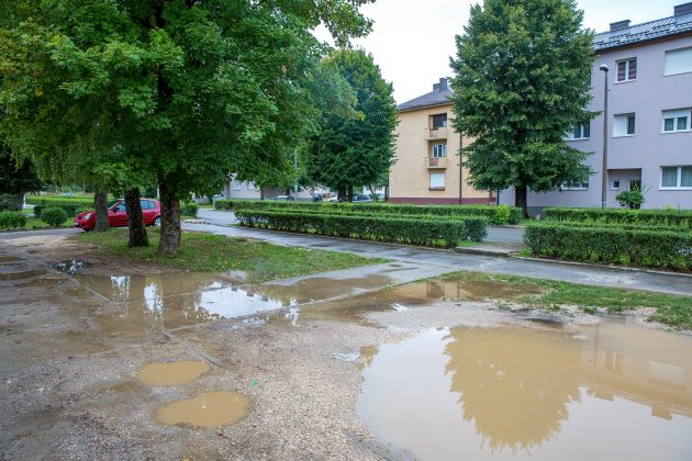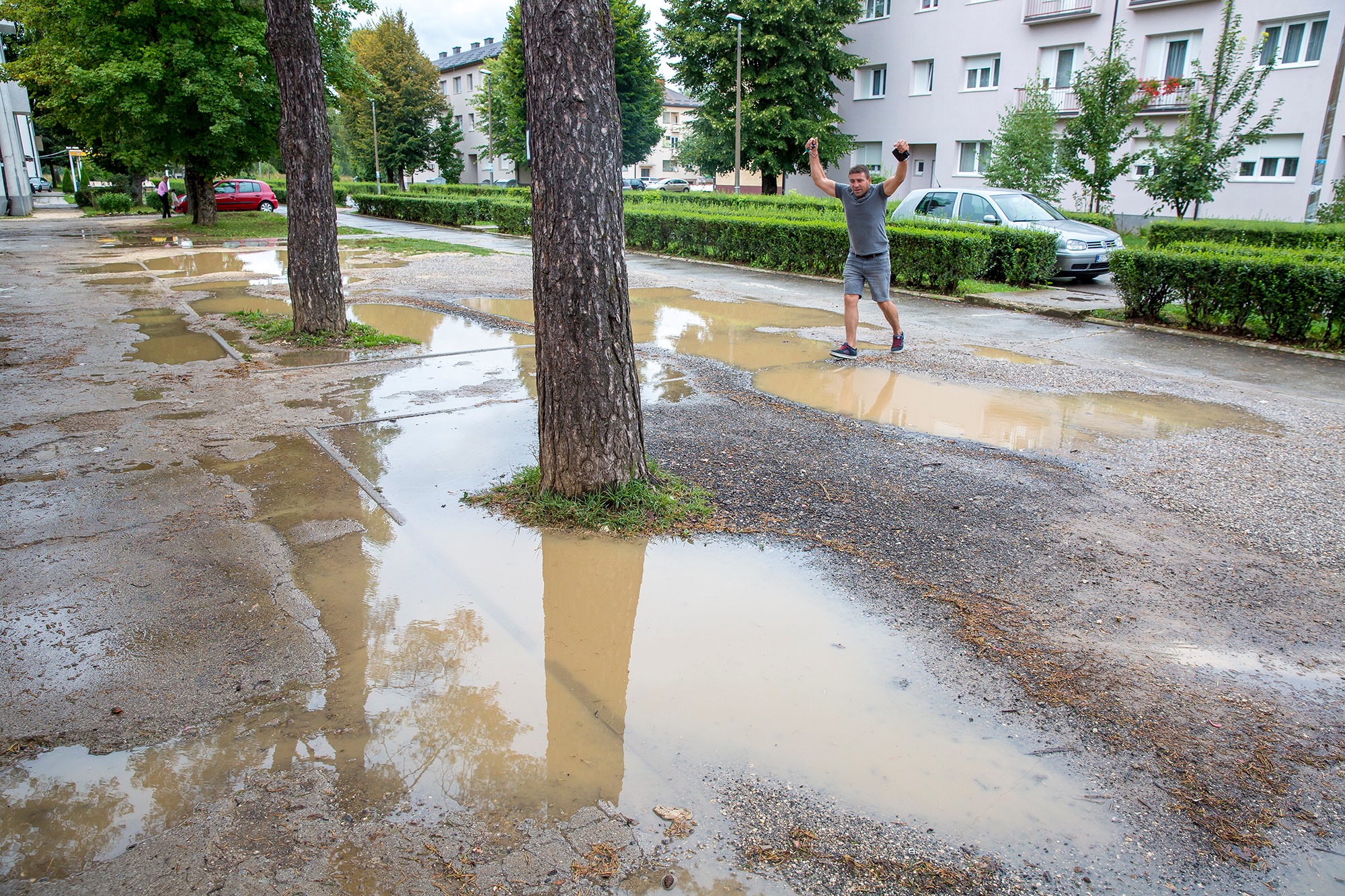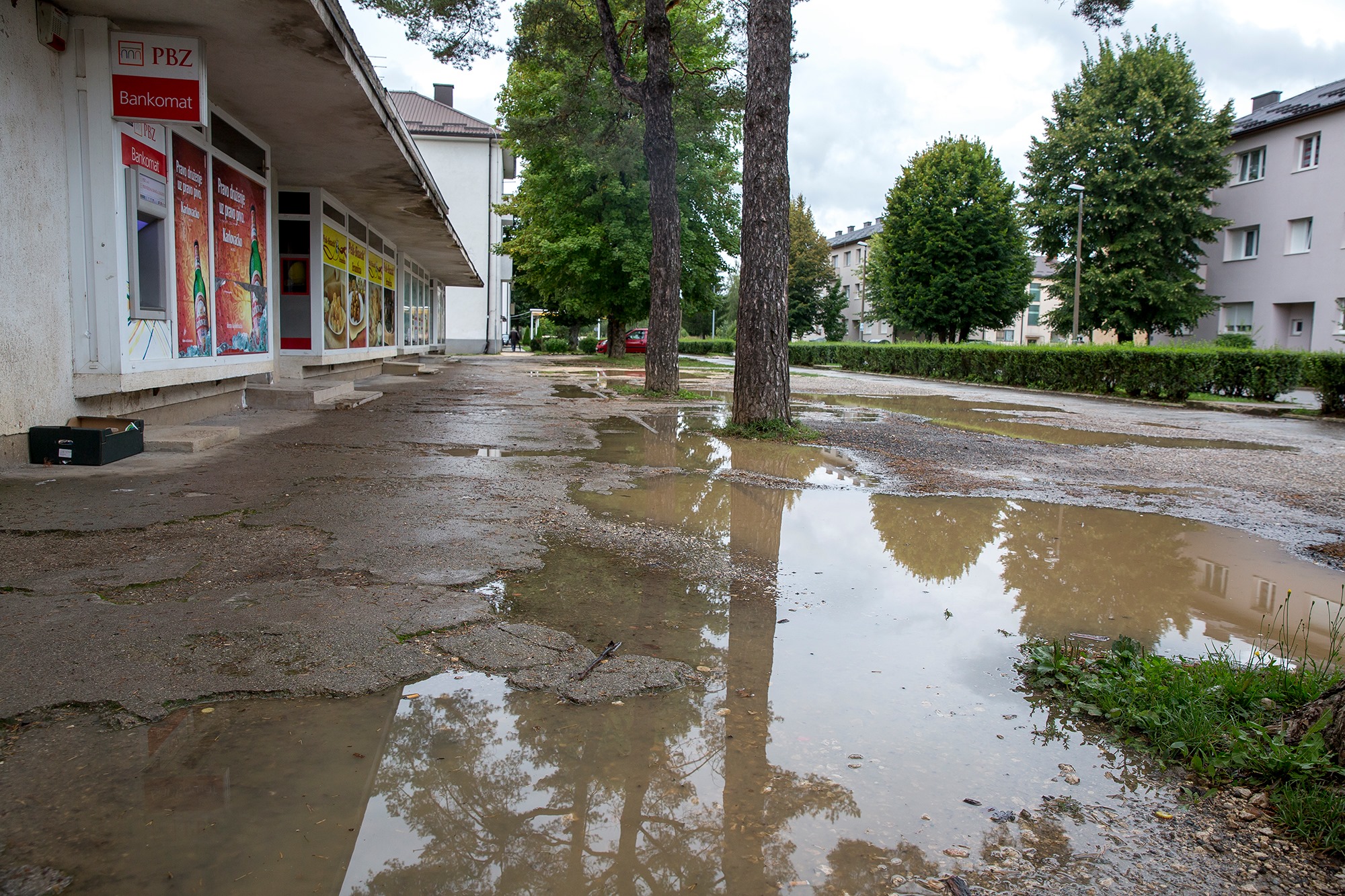 Saniranjem Trga žrtava Široke Kule u naselju Lički Osik nastoji se barem malo popraviti “image” ovom dijelu Grada Gospića. Koliko je to uzaludan trud vidi se u mnogim detaljima koje smo danas ondje zatekli. Palo je nešto kiše i tzv. zelene površine postale su kaljuže nedostojne bilo koje selendre. Prilikom preskakanja jedne od tamošnjih lokava zatekli smo jednog mladića. Podigao je ruke u znak čuđenja ili se možda predao pred preprekama koje su ga dočekale uz jednu od tamošnjih trgovina.