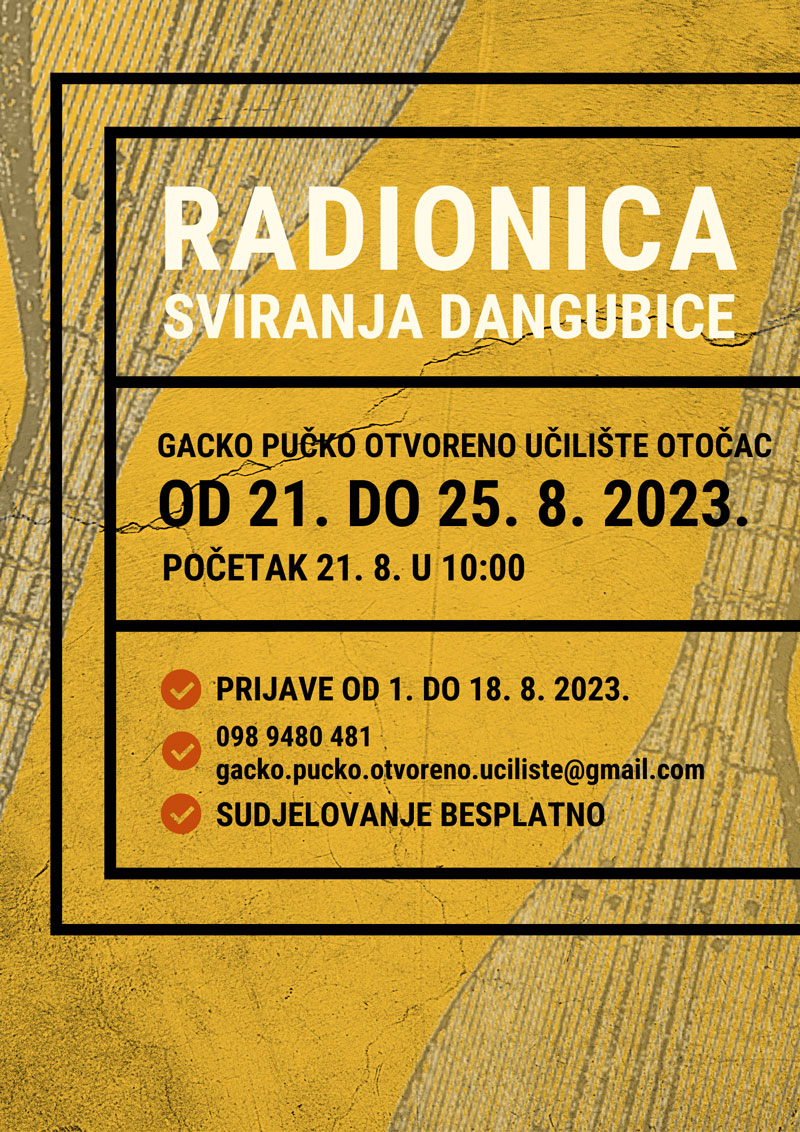Petodnevna besplatna radionica sviranja dangubice održat će se u Gackom pučkom otvorenom učilištu u Otočcu u periodu od 21. do 25. 8. 2023. godine. Radionica će se održati pod vodstvom Darka Čuvidića i Darka Kranjčevića, a namijenjena je i početnicima i onima s već stečenim iskustvom u sviranju ovog tradicionalnog glazbala.