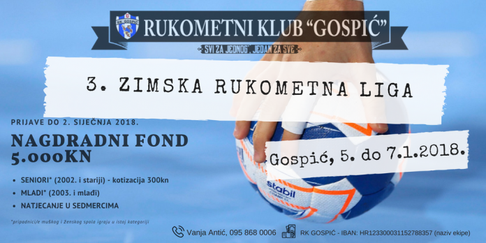 I ove zime će se održati Zimska rukometna liga koja će se odigravati u Gradskoj sportskoj dvorani u Gospiću od 5. do 7. siječnja 2018. godine. Igrat će se mali rukomet 4+1 (7 igrača u ekipi), a prijaviti se mogu klubovi, školske ekipe, te svi rukometaši, ali i rekreativci koji se žele okušati u rukometu. Natjecat će se u kategorijama mlađih uzrasta (2003. godište i mlađi), te kategoriji seniora (od 2002. godišta do veterana). Nagradni fond je 5000 kuna.