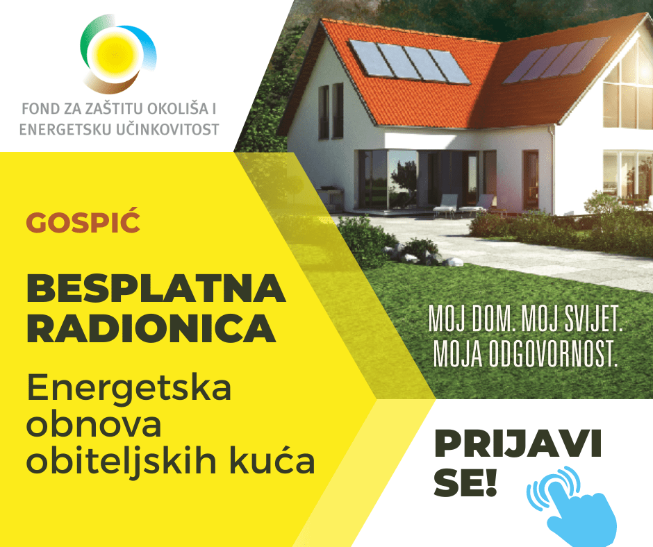 Fond za zaštitu okoliša i energetsku učinkovitost u suradnji s Ličko-senjskom županijom, poziva na besplatnu radionicu za energetsku obnovu obiteljskih kuća, koja će se održati u Gospiću u utorak, 28. rujna s početkom u 10 sati u POU Ante Starčevića, Ulica Franje Tuđmana 5.