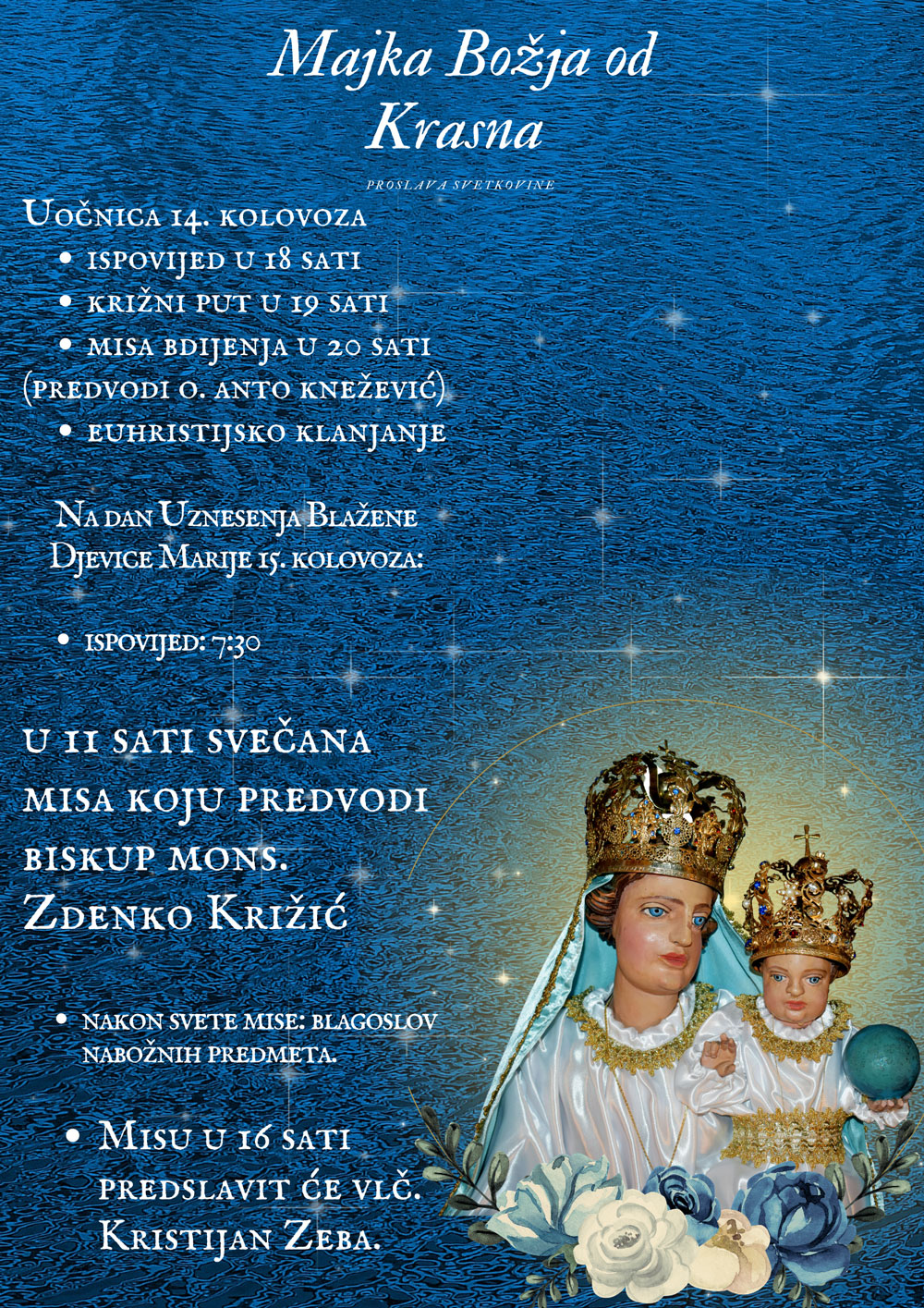 Uočnica proslave Velike Gospe 14. kolovoza, započeti će prilikom za ispovijed u 18 sati, dok će pobožnost Križnog puta započeti u 19 sati.