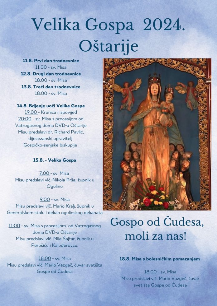 Home Gospić Proslava Velike Gospe u Ogulinskim Oštarijama GospićKulturavijesti Proslava Velike Gospe u Ogulinskim Oštarijama By Nikola Mraović - 6 kolovoza, 2024 0 Facebook Gs Press RELATED ARTICLESMORE FROM AUTHOR Odgovor saborskog zastupnika Zvonimira Troskota gradonačelniku Gospića Darku Milinoviću Otkrivene lokacije na kojima se ove godine vozi svjetski spektakl WRC Croatia Rally Demantij Milinovića: „Gospodine Troskot pločice u ramenu je lako mijenjati, ali opasne su one u glavi“