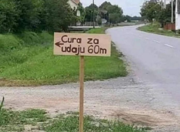 Ljudska domišljatost doista nema granica! Dokazao je to jedan mladić koji ne zna kako bi se iz obiteljskog doma riješio sestre. Umjesto semafora ili nekog drugog prometnog znaka na ovom raskršću postavljena je ploča s natpisom „Cura za udaju, 60 metara lijevo“!