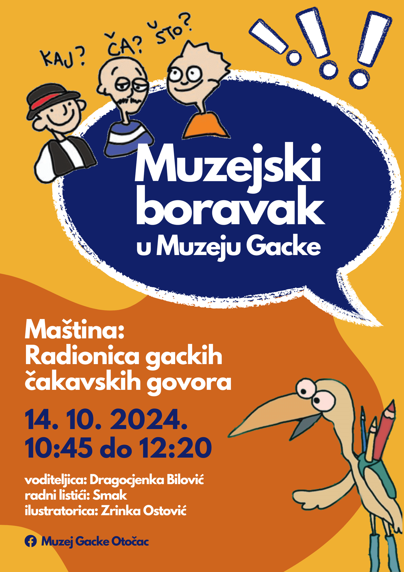 Ova radionica održava se u i sklopu manifestacije “Dani europske baštine” i ističe bogatstvo jezika kao mosta koji povezuje generacije i zajednice. Gacki čakavski govori prepoznati su kao nematerijalno kulturno dobro Republike Hrvatske i čuvaju jedinstvenu jezičnu tradiciju našeg kraja. S ciljem očuvanja jezičnih posebnosti i prenošenja znanja budućim generacijama polaznici ove radionice učit će o hrvatskim narječjima i specifičnostima gackih čakavskih govora, a radionica će biti popraćena radnim listićima koje su u suradnji s Muzejom Gacke izradili Smak d. o. o. i ilustratorica Zrinka Ostović.
