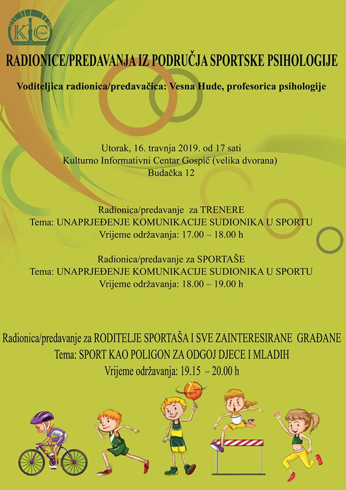 Kulturno Informativni Centar Gospić i Zajednica sportova grada Gospića organiziraju radionice/predavanja iz područja sportske psihologije. Voditeljica radionica/predavačica je profesorica psihologije Vesna Hude koja djeluje kao dječji i sportski psiholog u Zagrebu i Samoboru, a po potrebi i diljem Hrvatske.