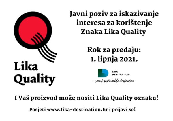 Javi poziv otvoren je do 1. lipnja ove godine. Obrasce za prijavu možete pronaći na poveznici https://www.lika-destination.hr/vijesti/detaljnije/javni-poziv-za-iskazivanje-interesa-za-koristenje-znaka-lika-quality, dok se za sve ostale informacije možete obratiti na e-mail info@lika-destination.hr, na broj telefona 053 647 042 ili u uredu Klastera u Gospiću.