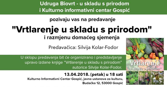 Kulturno Informativni Centar Gospić i Udruga „Biovrt – u skladu s prirodom“ organiziraju predavanje na temu “Vrtlarenje u skladu s prirodom”, a nakon predavanja održat će se razmjena domaćeg sjemenja.