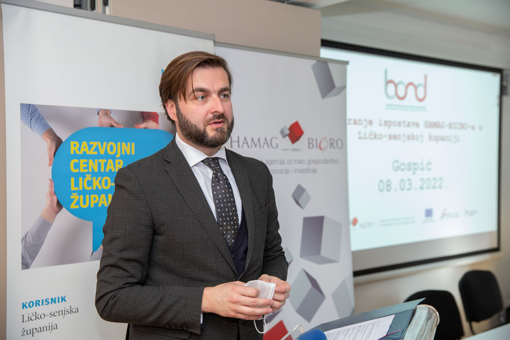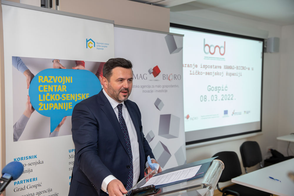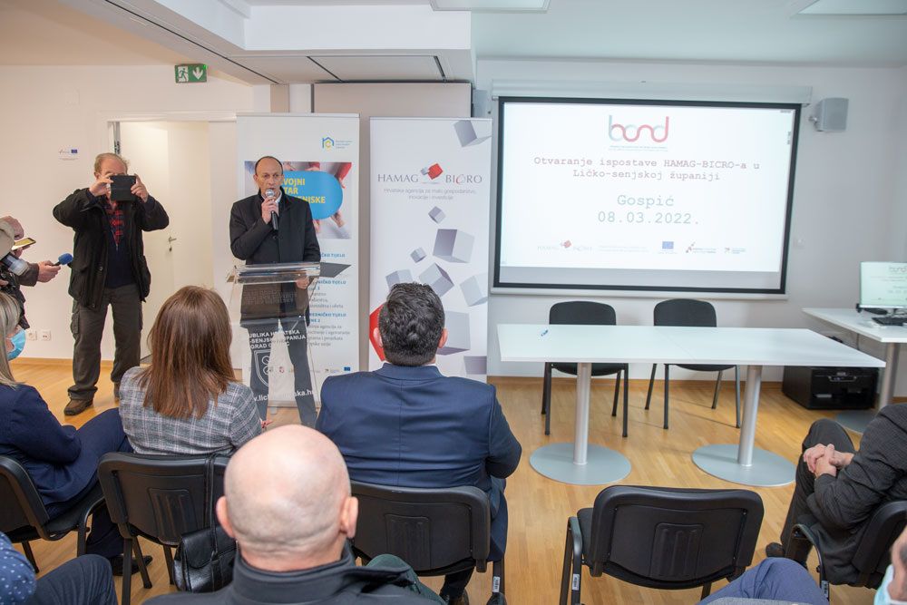 Ličko-senjska županija unatrag 7-8 mjeseci intenzivno radi na podizanju gospodarstva u našoj Županiji. Pri tome ima veliki oslonac Ministarstva gospodarstva i održivog razvoja. U tijeku su brojne aktivnosti na pokretanju poduzetništva u Ličko-senjskoj županiji, a javnost je upoznata kako smo sve ovo vrijeme imali intenzivne aktivnosti sa svim resornim Ministarstvima Vlade RH. Zato s pravom očekujemo veliki broj investitora, od javnih ustanova i poduzeća do privatnih ulagača. To se događa disperzivno, po cijeloj županiji, u svim Gradovima i Općinama. Upravo će agencija HAMAG-BICRO intenzivno pratiti taj razvoj koja od danas ima svoj ured u Gospiću, kazao je župan Petry. Predsjednik Uprave HAMAG-BICRO Vjeran Vrbanec: