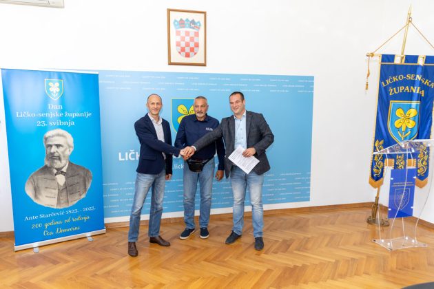 –S nama su ravnatelj Razvojnog centra Ličko-senjske županije Mile Milković i odabrani izvođač radova temeljem Javnog natječaja „Kroma“ d.o.o. i njezin direktor Marijan Krmpotić. Mogu najaviti kako ćemo na brojnim ustanovama kojima je osnivač Ličko-senjska županija ugrađivati opremu za proizvodnju električne energije iz obnovljivih izvora. Tako smo i danas u ovoj zgradi započeli radovi vezani uz dizanje topline, u tom smislu obnavljamo i županijski vozni park, nedavno je na zgradi Osnovne škole u Otočcu, kojoj je Županija osnivač, instaliran sustav za dobivanja električne enegije iz sunčevih panela.