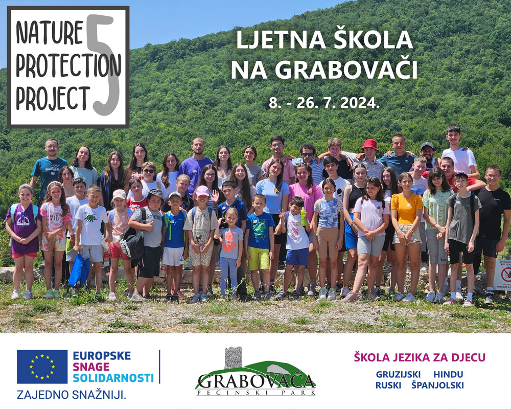 Na 10. po redu Ljetnoj školi na Grabovači prijavljen je rekordan broj djece, ukupno 44! Volonteri projekta “Zaštita prirode 5”, financiranog iz programa Europskih snaga solidarnosti, dolaze iz čak šest država, a za djecu je u ponudi i škola stranih jezika: ruski, hindu, gruzijski ili španjolski. U sklopu Ljetne škole, sudjeluju i mladi belgijski izviđači, koji će djeci, volonterima i zainteresiranima prezentirati izviđačke aktivnosti i život u prirodi. Aktivnosti izvode volonteri, izviđači i djelatnici JU, a odvijaju se na području Pećinskog parka Grabovača. Škola će trajati tri tjedna (8.-26.7.2024.), a za djecu organizirane brojne aktivnosti od pravila ponašanja u prirodi, upoznavanja špiljskih ekosustava, bioraznolikosti i georaznolikosti područja pa do učenja o vodenim ekosustavima, klimatskim promjenama i  snalaženja u prirodi.