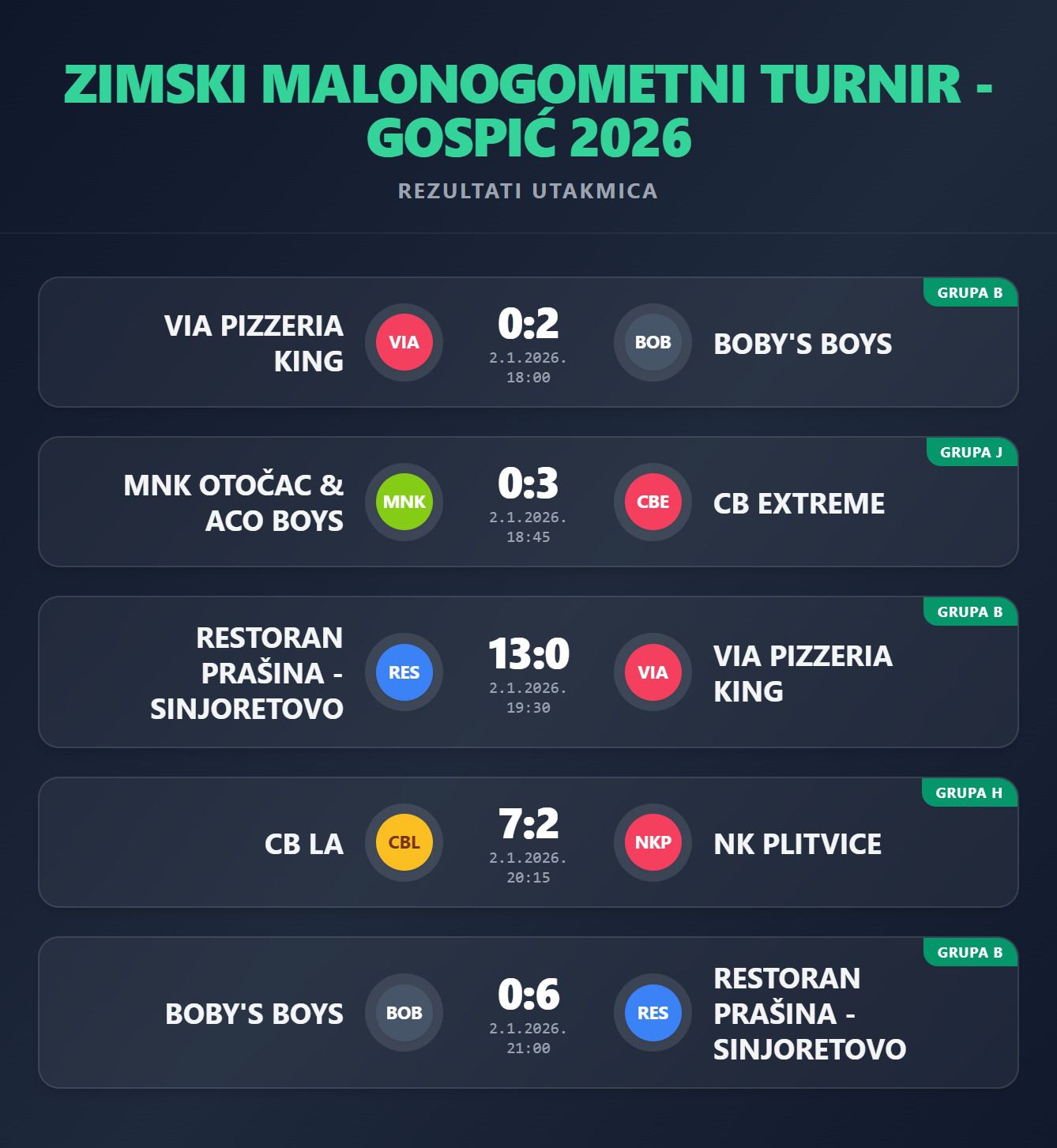 Home Gospić Rezultati utakmica turnira Gospić 2026. GospićSportvijesti Rezultati utakmica turnira Gospić 2026. By Nikola Mraović - 3 siječnja, 2026 0 Facebook Gs Press RELATED ARTICLESMORE FROM AUTHOR Odgovor saborskog zastupnika Zvonimira Troskota gradonačelniku Gospića Darku Milinoviću Otkrivene lokacije na kojima se ove godine vozi svjetski spektakl WRC Croatia Rally Demantij Milinovića: „Gospodine Troskot pločice u ramenu je lako mijenjati, ali opasne su one u glavi“ Predstavnici Savjeta mladih LSŽ posjetili OB Gospić povodom Svjetskog dana bolesnika Biskup Marko Medo predvodio misno slavlje i blagoslovio Opću bolnicu Gospić
