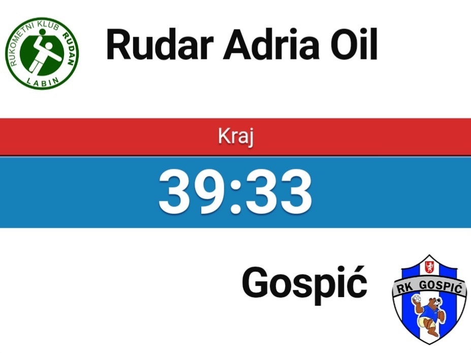 RK RUDAR ADRIA OIL – RK GOSPIĆ 39:33 (19:14) – Markić (14), Matulović (6), Jelić (5), Dželalija (3), Verzon (2), Kovačević (1), Petrović (1), Pavelić (1)