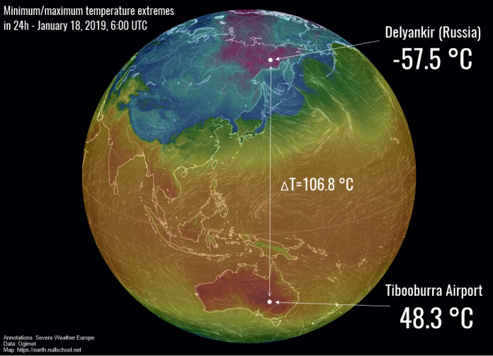 Sinoć su se u Rusiji temperature spustile skoro pa do -60 C, a u Australiji toplinski val diže temperature do +50 C.  Jutros u 7 sati Gospić je mjerio “normalnu” temperaturu od -2,2 C.  S obzirom na extremne temperature od gotovo 100 C razlike između Australije i Rusije, Gospić se nalazi u zlatnoj sredini!