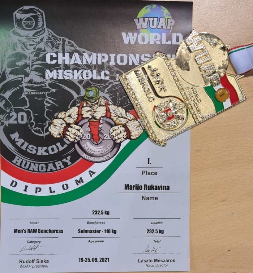 Rukavina je nastupio u svojoj standardnoj kategoriji do 110 kg te je podigao 232.5 kg. Ovim rezultatom Rux je postao svjetski prvak u svojoj kategoriji te ukupni pobjednik kategorija! Nakon titule svjetskog prvaka po GPC i XPC pravilima iz 2019., te poslije prošlogodišnje prazne korona-sezone natjecanja zbog čestih lockdowna, Rukavina osvaja titulu svjetskog prvaka i u WUAP federaciji. Inače, ovaj rezultat je najbolje Ruxovo ostvarenje do sada, za 2.5 kg bolje od prethodnog rekorda. Marijo je odavno nadišao nacionalne okvire te je i više nego jasno da je ovo najbolji hrvatski rezultat u bench pressu u povijesti ovog sporta, i apsolutno i u ovoj kategoriji. 232.5 kg je novi balkanski rekord kojim se Rukavina potvrđuje kao najbolji bencher regije i neprikosnoveni vladar svoje kategorije.