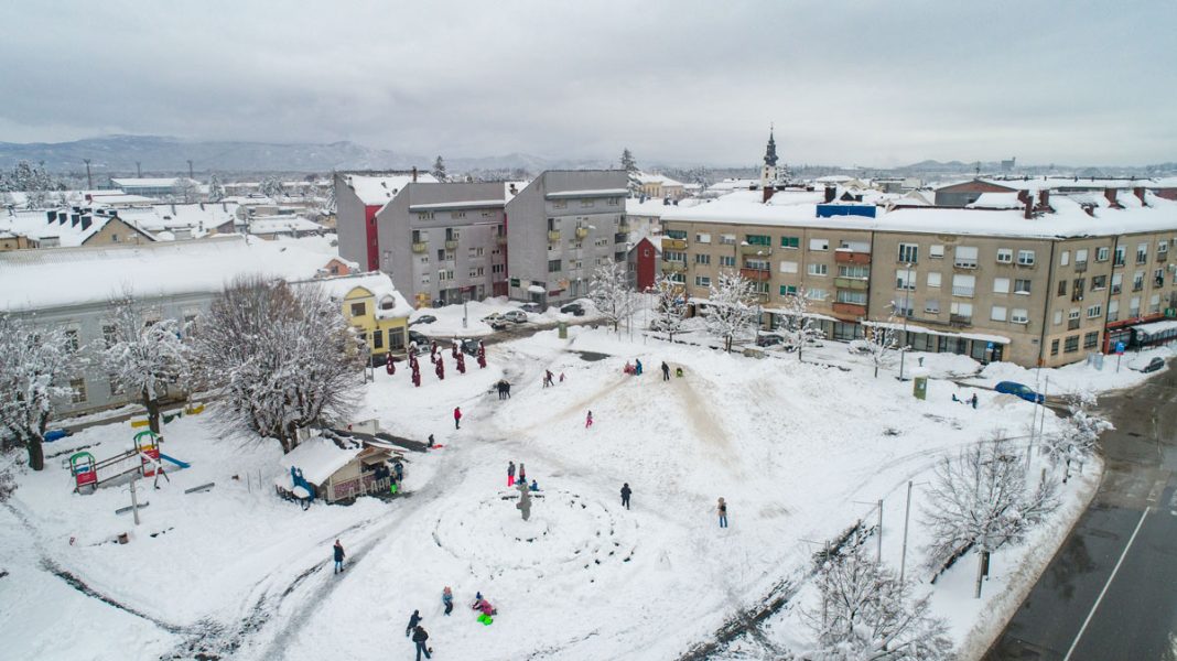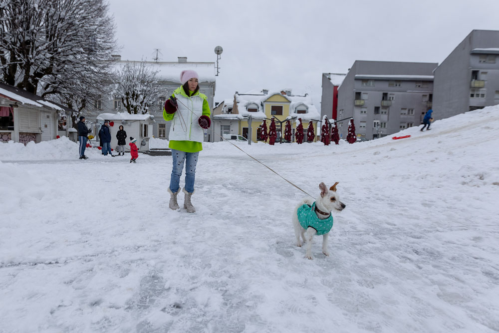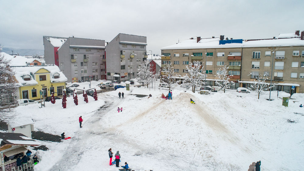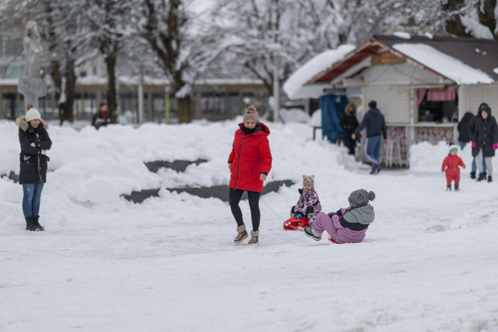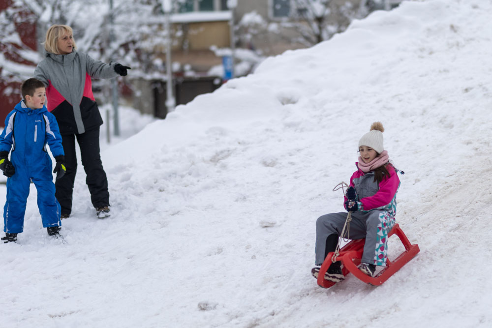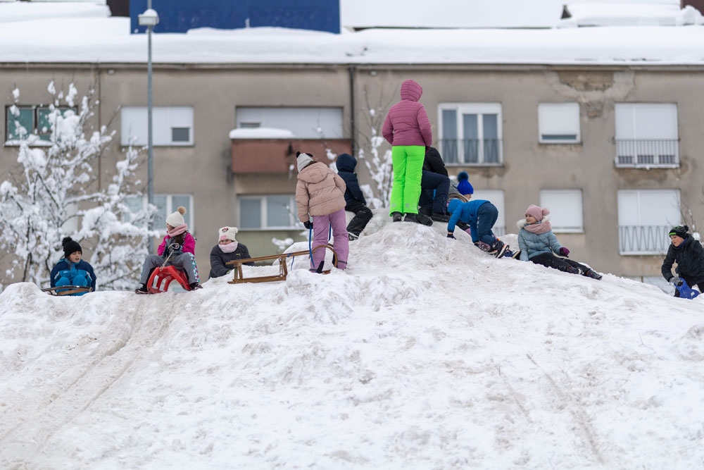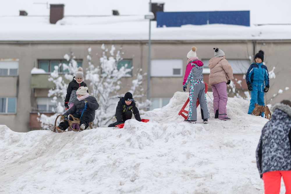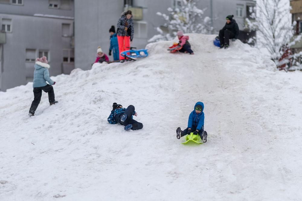 Višak snijega s gospićkih ulica deponiran je na Trgu Stjepana Radića. Točnije dio snijega jer bi se u ukupnoj količini tog ledenog balasta mogla načiniti 3-4 sanjkališta. Samo dio klinaca stigli su danas na sanjkalište. Neki su poveli roditelje, neki kućne ljubimce, neki donijeli sanke. Došli su i neki nadobudni klinci i spuštali se niz umjetno sanjkalište na svojim skafanderima.