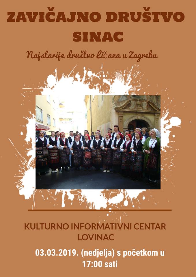 Znate li koja je najbrojnija i najstarija udruga Ličana u Zagrebu? „Prvo među jednakima“ je Zavičajno društvo „Sinac“ koje će ove nedjelje, 3. ožujka gostovati u Lovincu. U tamošnjem KIC-u  s početkom od 17 sati  publika će vidjeti Društvo koje njeguje izvorne tradicijske običaje Gacke doline i Like.