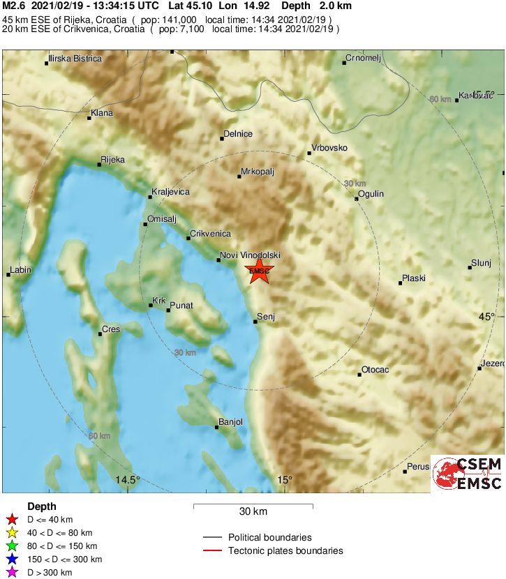 Prema podacima EMSC-a, magnituda potresa je iznosila 2.6 prema Richteru, a epicentar je bio 20 kilometara istok-jugoistočno od Crikvenice.