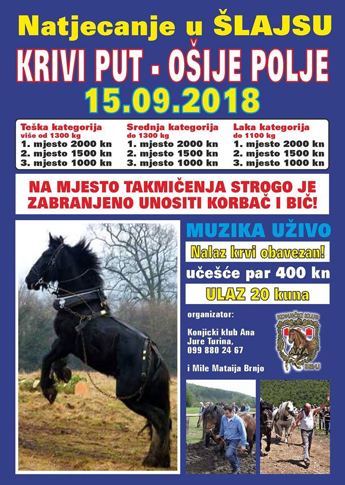 Konjički Klub Ana iz Senja oraganzira natjecanje u povlačenju trupca („šlajsu“) i natjecanje kosaca iz Licko-senjske županije U mjestu Francikovac u Ošijem Polju 15. rujna svjedočit ćemo tim drevnim vještinama, uz bogat i raznolik program. Sve je više poklonika ove drevne vještine koja se i danas koristi pri sječi šuma i izvlačenju trupaca. Osim najjačih konja u sklopu natjecanja održat će se i olimpijada starih sportova na kojoj će sudjelovati najjače muške i ženske ekipe iz ovoga dijela Hrvatske. Na manifestaciji ručne košnje najavljene su  skupine Kuprešaka i Gospićana.