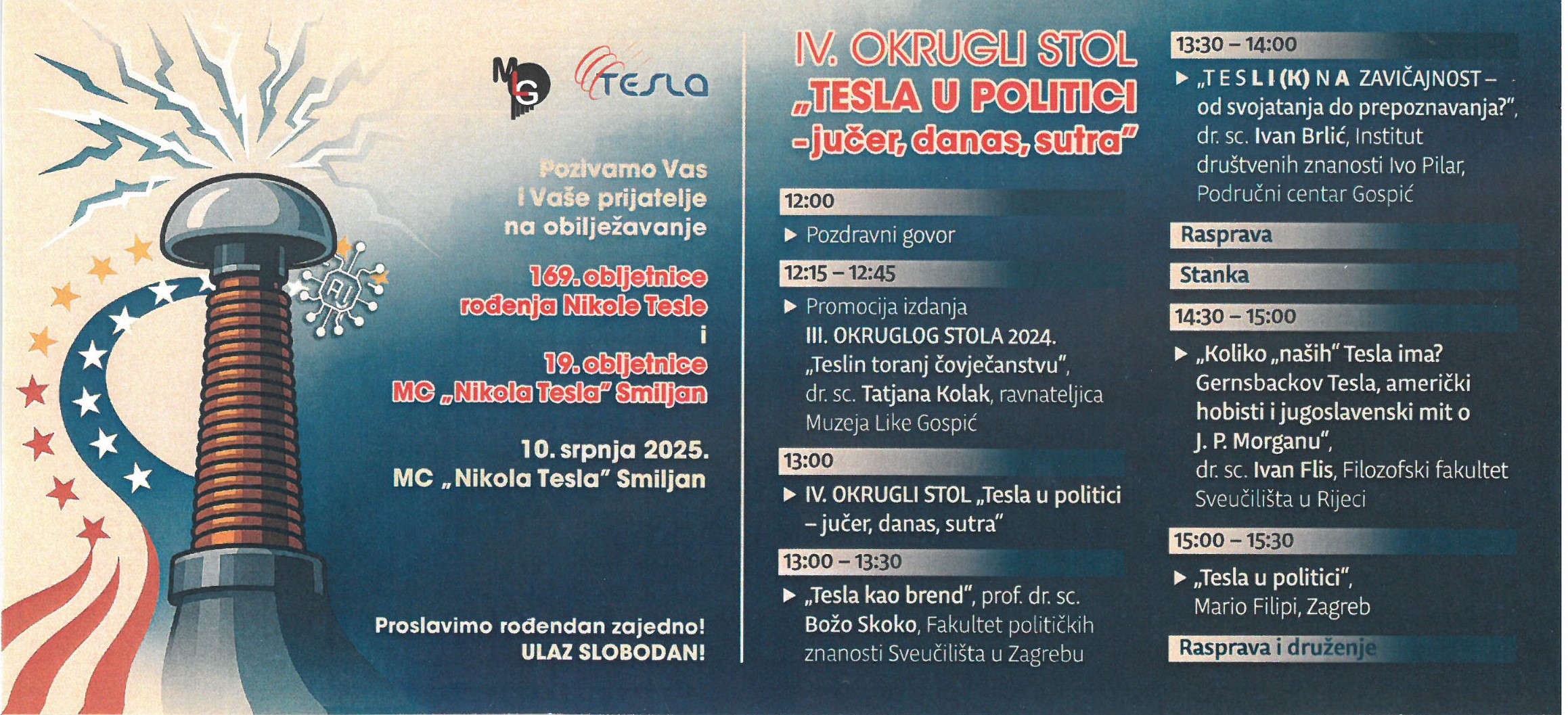 Središnji dio događanja, IV. Okrugli stol „Tesla u politici – jučer, danas, sutra“, okuplja stručnjake iz različitih disciplina kako bi analizirali način na koji se Teslin lik i djelo koriste u javnim politikama, brendiranju i identitetu. Prvo izlaganje „Tesla kao brend“ održat će prof. dr. sc. Božo Skoko s Fakulteta političkih znanosti u Zagrebu, dok dr. sc. Ivan Brlić iz gospićkog područnog centra Instituta društvenih znanosti Ivo Pilar otvara raspravu o zavičajnom prisvajanju Tesle. Nakon stanke, dr. sc. Ivan Flis s Filozofskog fakulteta u Rijeci progovorit će o raznim „našim“ Teslama, od američkih hobista do jugoslavenskih mitova, a završno izlaganje „Tesla u politici“ pripada publicistu Mariju Filipiju. Svako predavanje prati otvorena rasprava, a druženje sudionika predviđeno je do 15.30 sati.