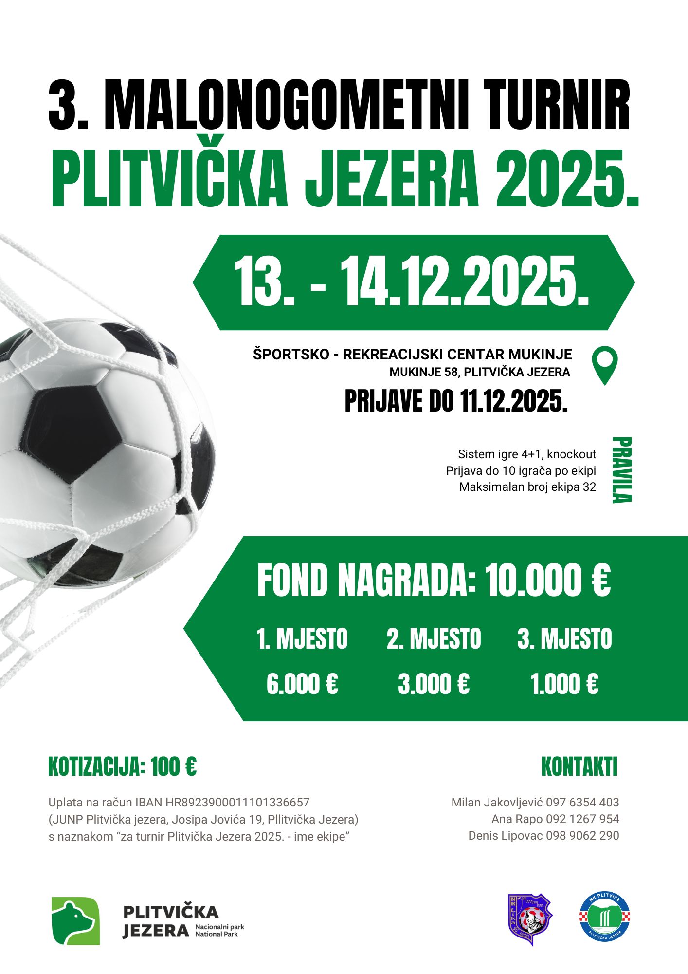 Plitvička jezera ponovno će postati središte sportskih događanja sredinom prosinca, kada će se održati 3. malonogometni turnir u organizaciji Nogometnog kluba Plitvice te uz podršku Javne ustanove Nacionalni park Plitvička jezera.