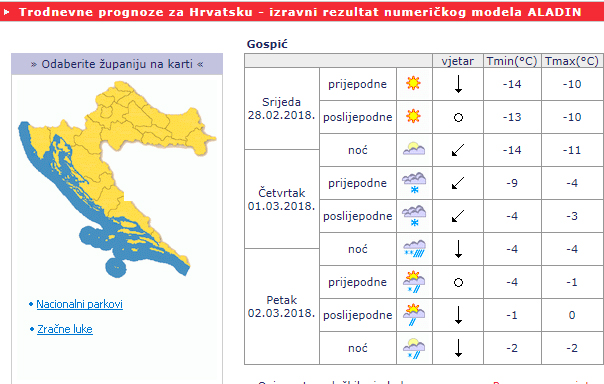 Još hladnije bit će ujutro u gorskim krajevima, uz temperaturu između -17 i -14 °C, a u noći i ujutro malo snijega još može pasti u Lici. Zatim barem djelomice sunčano uz temperaturu između -11 i -8 °C. Uz obilje sunca na sjevernom Jadranu jutro će također biti hladno, između -10 i -5 °C. Puhat će umjerena, podno Velebita prijepodne i jaka bura.