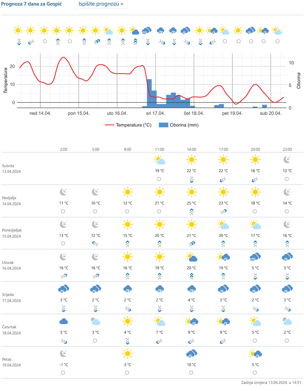 Pretežno sunčano te iznimno toplo na kopnu će biti i iduća dva dana, a u nedjelju ponegdje može biti i vruće. U utorak sa sjevera postupni porast naoblake, pa do kraja dana u mnogim krajevima kiša, često u obliku pljuskova, vjerojatno praćenih grmljavinom. Jugozapadnjak u jačanju, a u utorak će okrenuti na sjeveroistočnjak uz pad dnevne temperature.