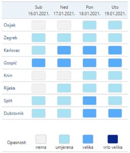 Jutarnja temperatura zraka na kopnu je između -10 i -5°C, u gorju i niža, dnevna svega oko 0°C, a jutarnjih minusa ima i na Jadranu. Povremeni sjeverac i bura pojačavaju dojam hladnoće. Bez znatnije promjene – uglavnom u nedjelju uz mjestimične oborine – bit će do utorka, kada slijedi zatopljenje s jugozapadnjakom i češćim oborinama, osobito u južnijim krajevima unutrašnjosti i na Jadranu, gdje će južina biti još izraženija”, kratko je, potom, HRT-ov prognostičar sažeo prognozu idućih dana.