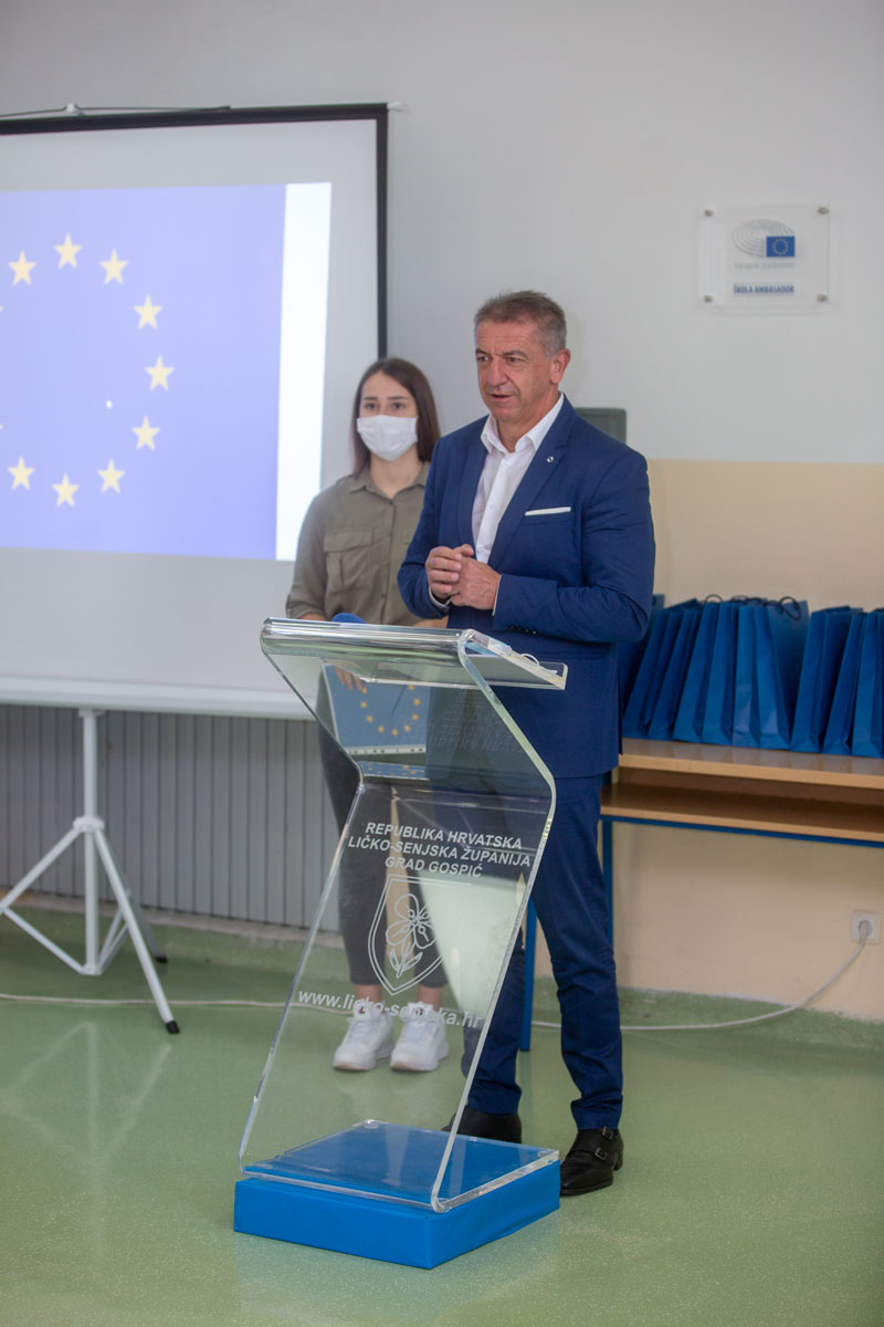 –U ovome kvizu nisam znao sva pitanja, ali sam ponešto naučio. Prije svega iskreno čestitam svima na uspjehu. Svim učenicama i učenicima, ravnatelju i mentorici. I sam sam bio učenik ove škole pa je tim veća čast sudjelovanja u ovoj promociji. Zato smo danas uz ovih 15 novih ambasadora svi mi u srcu Europe. Bio sam potpredsjednik Vlade RH kada smo završili pregovore o pristupanju EU. Vi već sada imate čast i obvezu promovirati sve ono dobro što EU donosi Hrvatskoj. Iznest ću podatak koji će „začepiti usta“ euro-skepticima: Sva ulaganja na području Ličko-senjske županije su sa preko 80 posto iz sredstava Europske unije! To bi u suprotnome značili da bi Hrvatska teško realizirala mnoge važne projekte. Spomenut ću samo projekt razminiravanja naše županije u koji EU ulaže preko 70 milijuna kuna svojih sredstava. Mi bismo i to sami postigli, ali daleko teže i sporije.