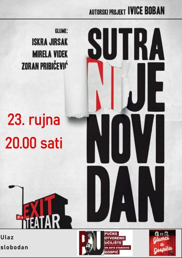 Na tragu svoje autorske uspješnice Kako misliš mene nema?! (odigrane preko 250 puta) Ivica Boban i Teatar EXIT vam predstavljaju tri nova mlada i talentirana glumca – Iskru Jirsak, Zorana Pribičevića i Mirelu Videk u predstavi Sutra (ni)jenovi dan! Oni se na temelju mnogostrukosti svojih osobnih, profesionalnih i društvenih identiteta u predstavi transformiraju u niz različitih likova i karaktera iz našega grada. Vidjet ćete ih – do grla u problemima, u suludim situacijama i interakcijama, sa svakovrsnim unutrašnjim i vanjskim konfliktima… i deliktima! Predstava je prilika da ih upoznate, da čujete njihove sulude, smiješno-gorke i potresne priče… jer i vas se tiču.