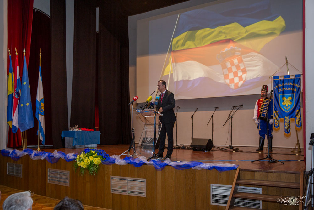 -Dragi prijatelji, uvaženi Ernest, poštovani Marijane i Anita. Drage Ličanke i Ličani, Ukrajinke i Ukrajinci. Ugodno je danas biti s vama i dijelom ove svečanosti. Nalazimo se u Županiji koja ima herojsko srce. Ličko-senjska županija je naša najveći prostor, ali nažalost s najmanjim brojem stanovnika. Zemljopisno spajate kontinentalnu i primorsku Hrvatsku, vi ste poveznica Zagreba i Dalmacije, preko vas idu mnoge prometne rute, prijevoz putnika i roba. Ovoj Županiji treba pomoć. Demografski je osakaćena, rat je učinio svoje, a slično je i s gospodarstvom.